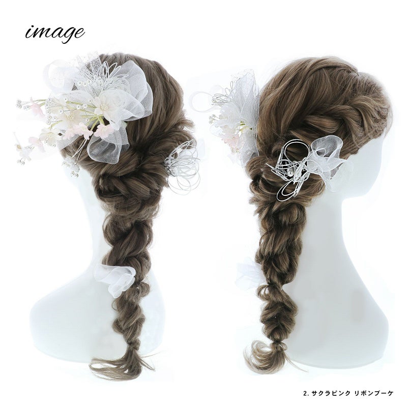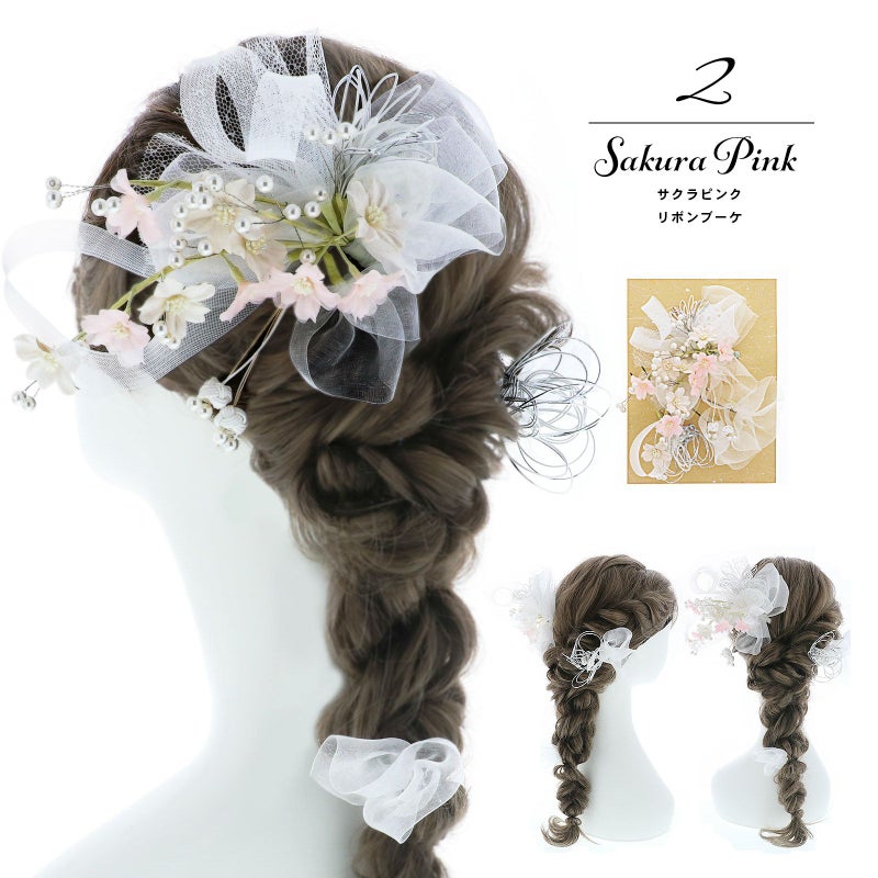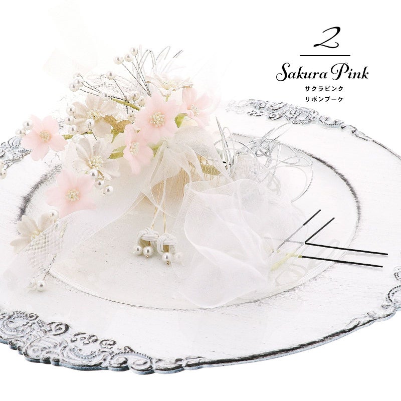 2.サクラピンク リボンブーケ:ペールピンク生地や表オフホワイトに裏ゴールド生地の桜の小花にパールや水引の蕾、白のカールしたチュールリボンやオーガンジーリボン、シルバーとホワイトの水引の百合の花を組み合わせたコーム1点。パールビーズの蕊に白と銀水引を結んだ花飾りUピン1点。白のオーガンジーリボン飾りのUピン2点。
