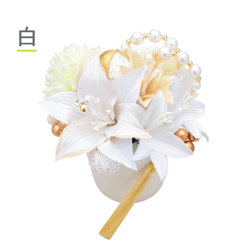 白のパールビーズにゴールドのビーズを組み合わせたU型のピンが2点。白に金通しの生地を組み合わせ、ラインストーンの蕊が輝く百合の花・大が1点、百合・小は光沢のある白が2点、ゴールドが1点。マムの造花はクリーム色の大1、オフホワイトの中1、玉飾り中は白地に金ラメとゴールドを組み合わせ、金糸の縁取りがあります。玉飾り小は白地に金ラメ。ビーズ飾りはつやのあるパールとブロンズを組み合わせたものと、ブロンズビーズが1点ずつ。金のタッセル。