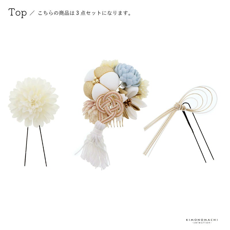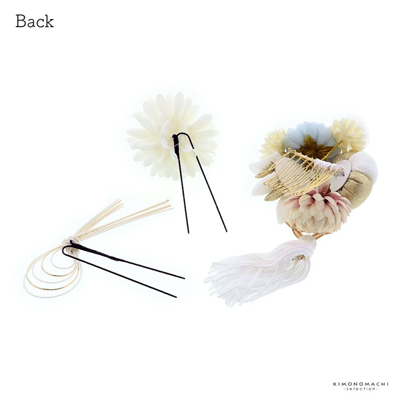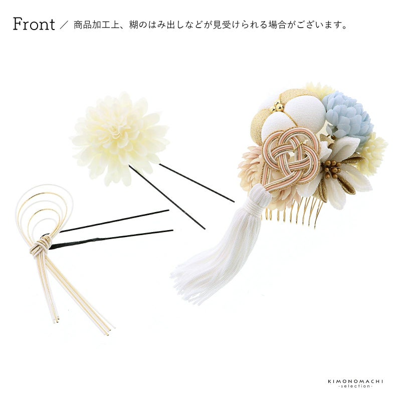 【色柄】白にゴールドの縮緬細工の万寿菊、剣つまみのお花、淡いブルーやピンク、オフホワイトのマムに白×ゴールド×淡いピンクの水引のあわじ結び、白いタッセルのコーム。オフホワイトのマムのUピン。白×ゴールドの水引結びのUピン。