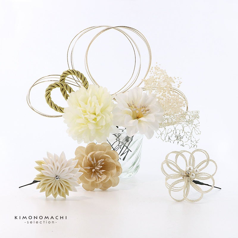 (卒業式応援75%SALE 2/19迄)成人式 髪飾り 卒業式 Uピンの8点セット「マムに綱飾り、カメリア、カスミソウ 白」日本製 水引き Uピン 振袖用髪飾り 結婚式 前撮り 後撮り 着物【メール便不可】