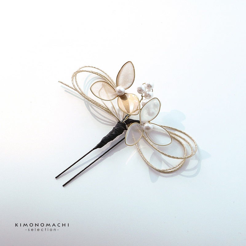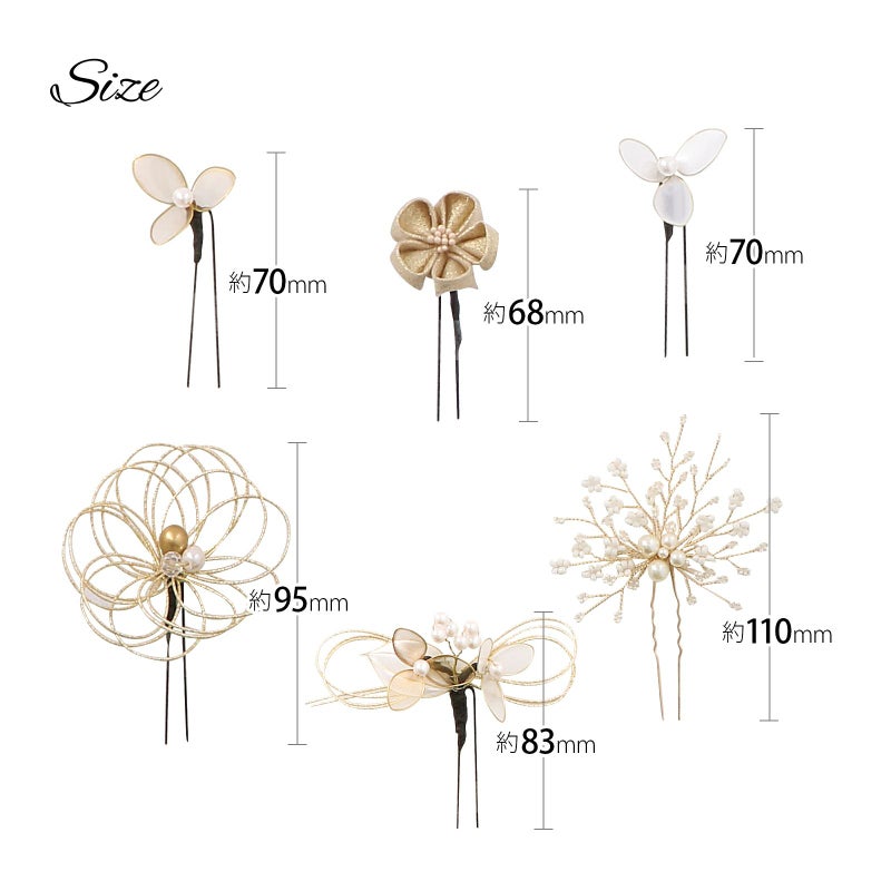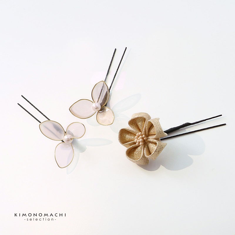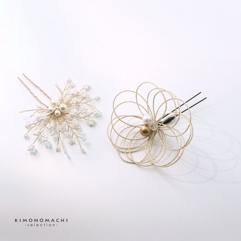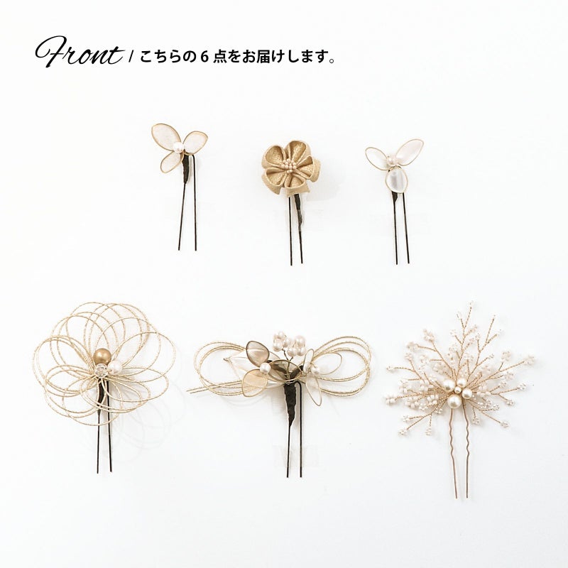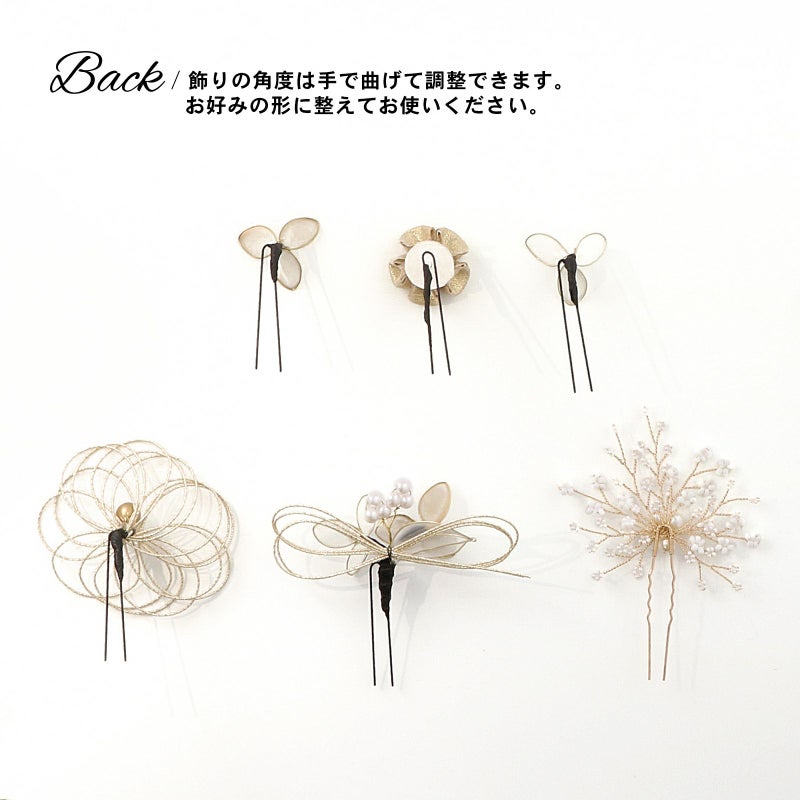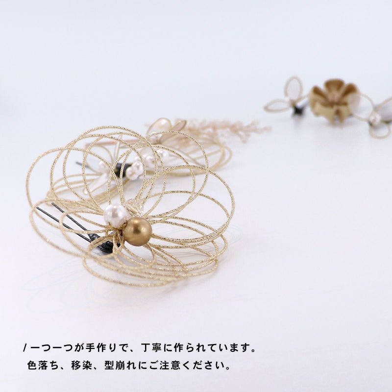 (卒業式応援75%SALE 2/19迄)成人式 髪飾り 卒業式 Uピンの6点セット「アメリカンフラワー三つ葉、水引、つまみのお花 白×ゴールド」日本製 水引き Uピン 振袖用髪飾り 結婚式 前撮り 後撮り 着物【メール便不可】