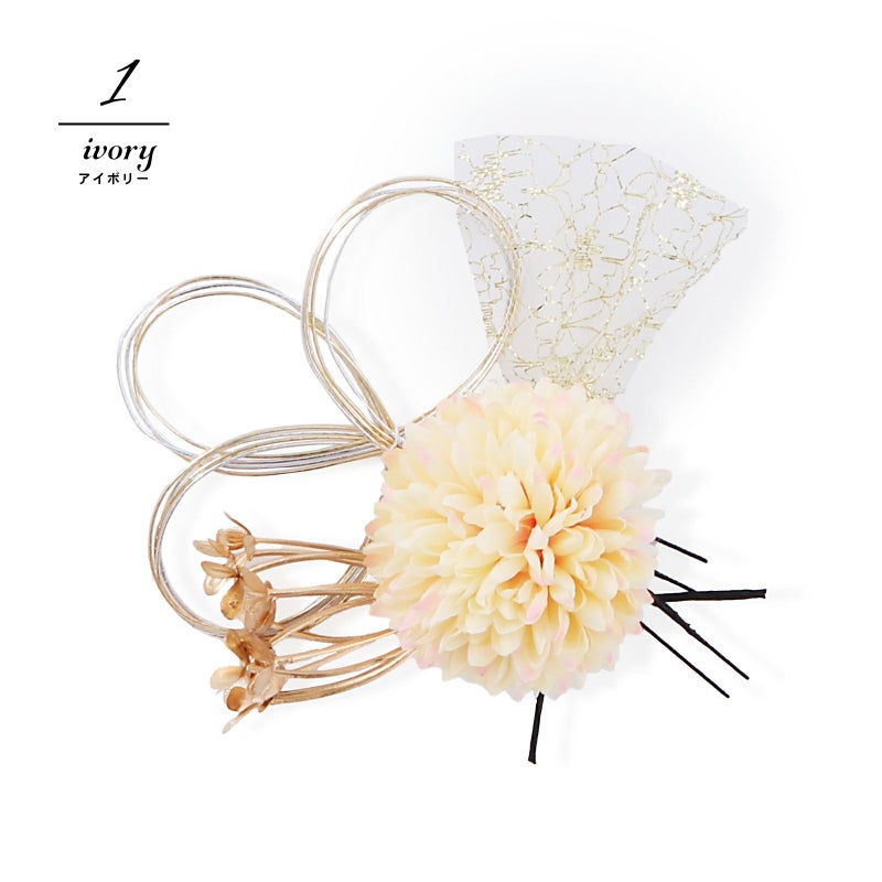 1.アイボリー:アイボリーに淡いピンクぼかしのマム、ゴールドのチュールリボン飾り、ゴールドとシルバーの水引の三つ輪、ゴールドの小花のUピンセット。