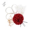 2.レッド:深い赤にダークレッドぼかしのマム、ゴールドのチュールリボン飾り、ゴールドとシルバーの水引の三つ輪、ゴールドの小花のUピンセット。