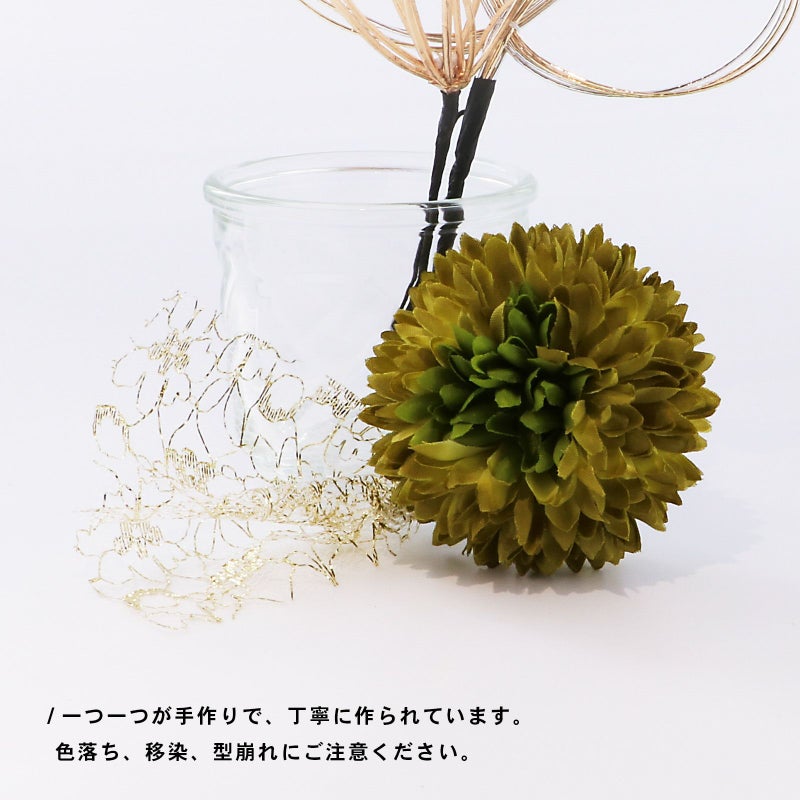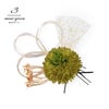 3.モスグリーン:抹茶色とモスグリーンのマム、ゴールドのチュールリボン飾り、ゴールドとシルバーの水引の三つ輪、ゴールドの小花のUピンセット。