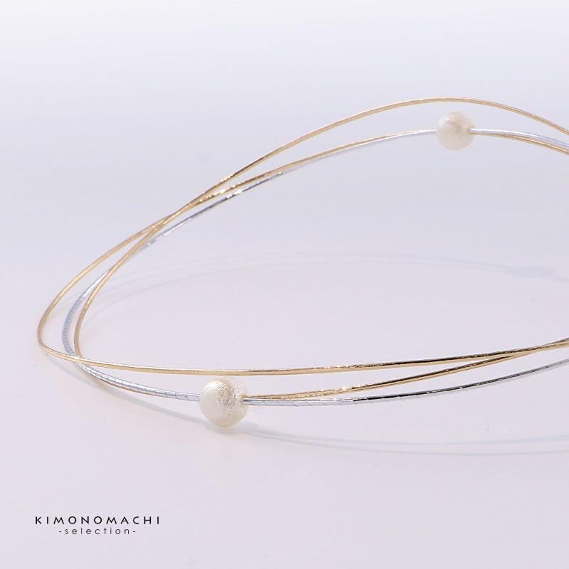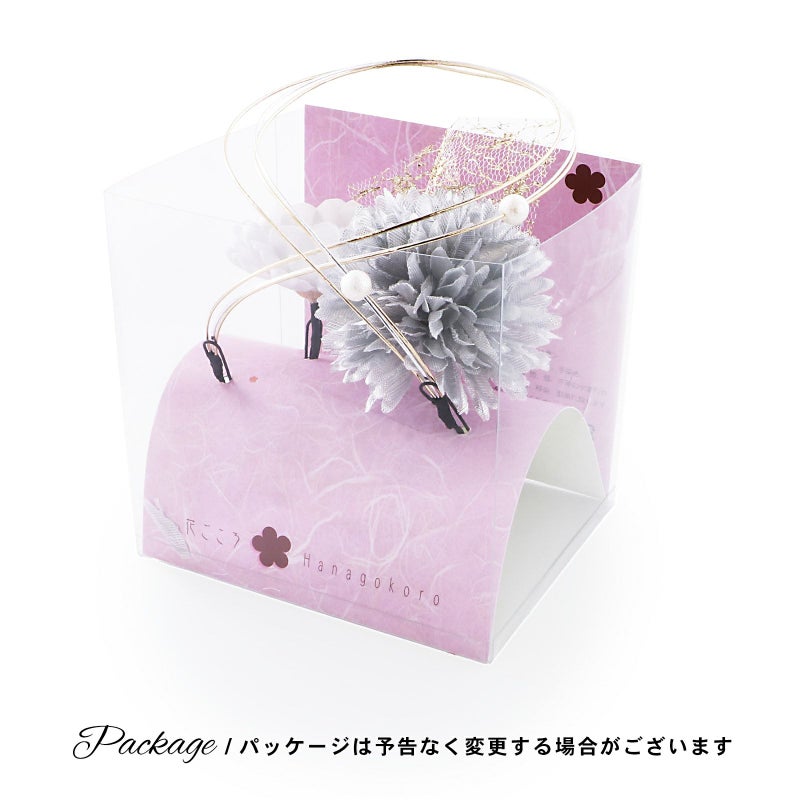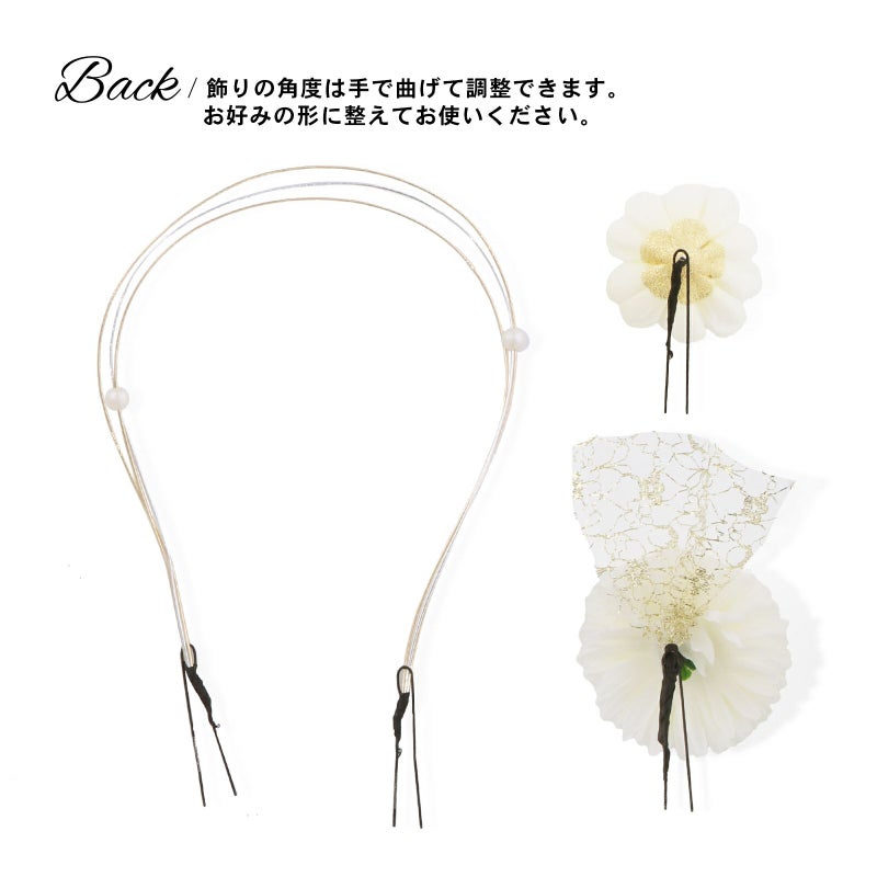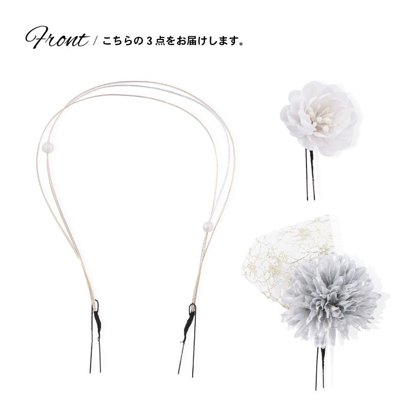 4.シルバー:シルバーのマムにゴールドのチュールレースリボンのUピン、ラメのペップに淡いシルバーグレーのカメリアの花のUピン、パール飾りのついたゴールドとシルバーの3本水引のUピンのセット。