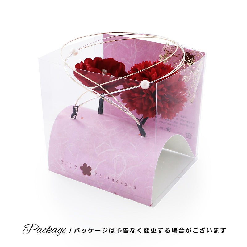 2.レッド:深い赤のマムにゴールドのチュールレースリボンのUピン、ラメのペップに深い赤のカメリアの花のUピン、パール飾りのついたゴールドとシルバーの3本水引のUピンのセット。