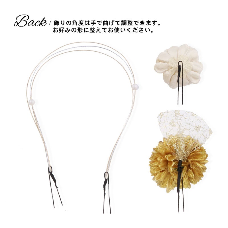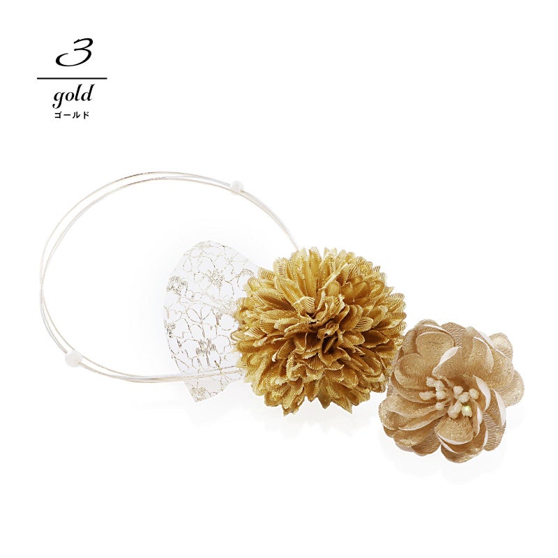 3.ゴールド:濃いゴールドのマムにゴールドのチュールレースリボンのUピン、ラメのペップに浅いゴールドのカメリアの花のUピン、パール飾りのついたゴールドとシルバーの3本水引のUピンのセット。