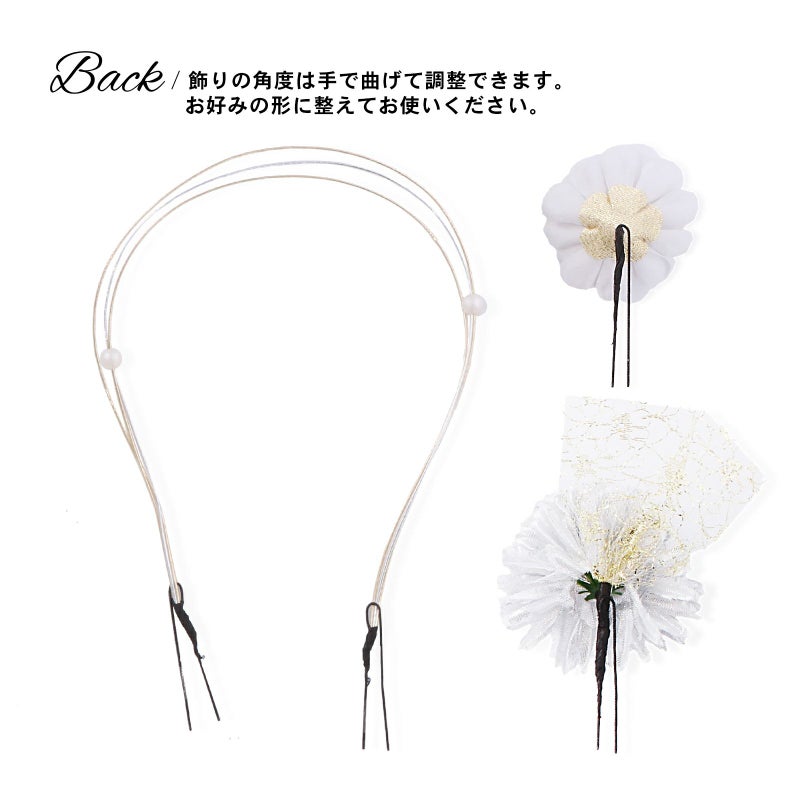 1.ホワイト:オフホワイトのマムにゴールドのチュールレースリボンのUピン、オフホワイトのカメリアの花のUピン、パール飾りのついたゴールドとシルバーの3本水引のUピンのセット。