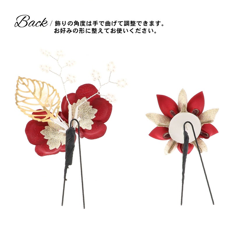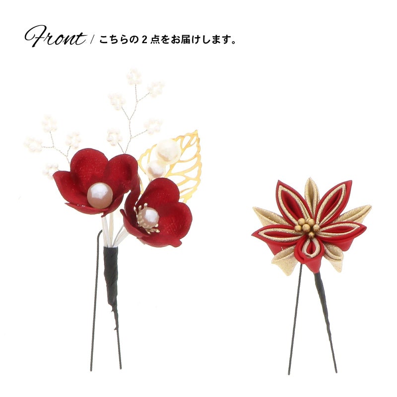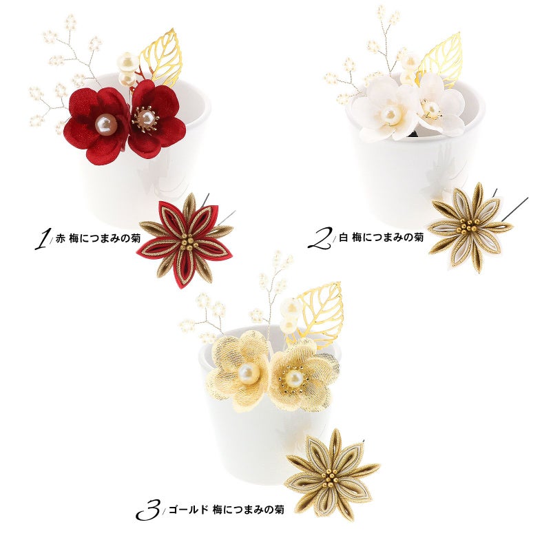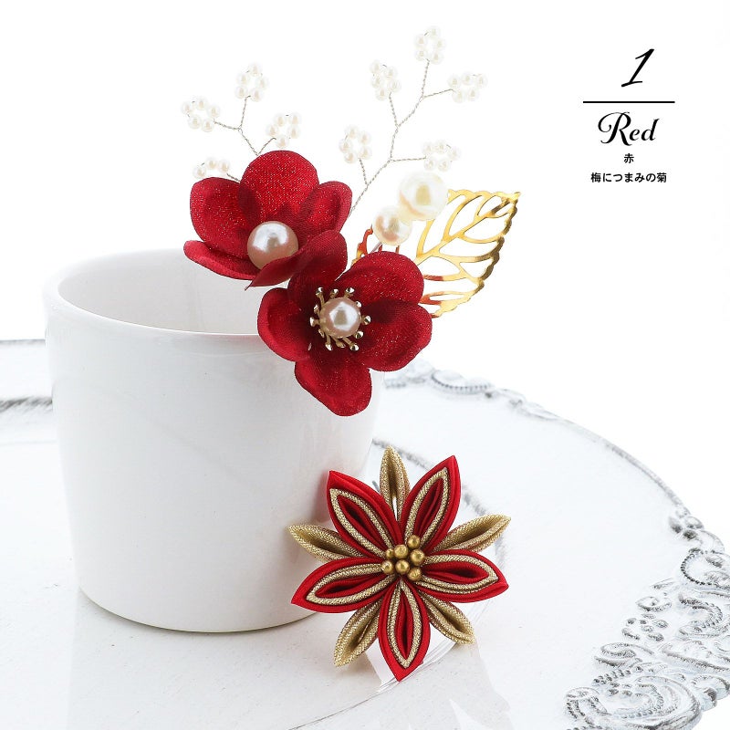 1.アカ 梅につまみの菊:深い赤の花びらにパールの蕊の梅2輪、白のビーズついた枝飾り、パールビーズにゴールドの透かしのメタルリーフのUピン1点。赤とゴールドの2重剣つまみの菊のUピン1点。