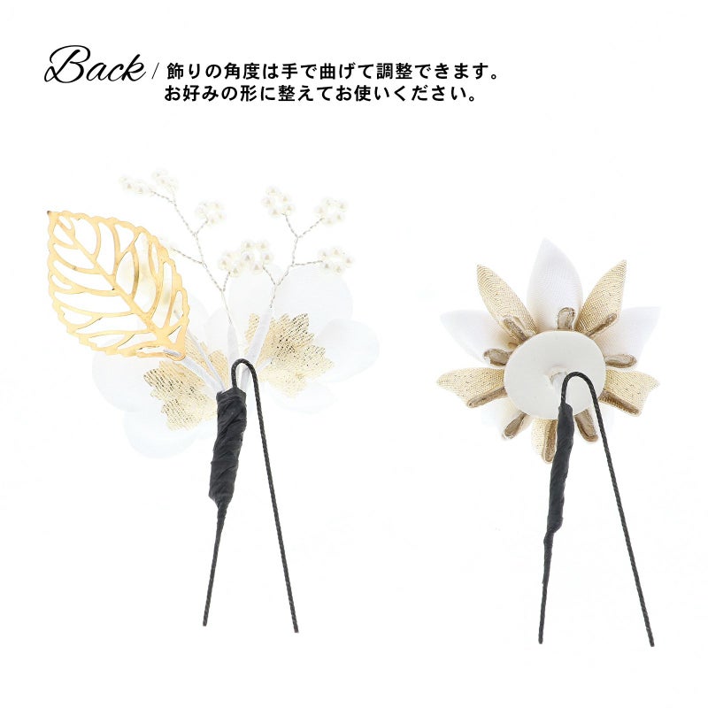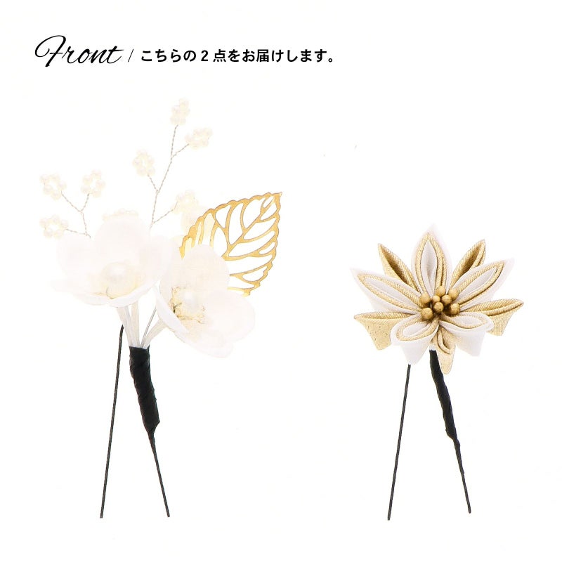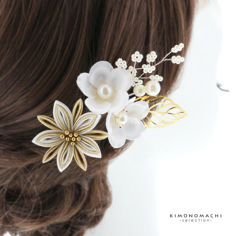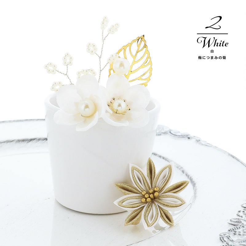 2.シロ 梅につまみの菊:白の花びらにパールの蕊の梅2輪、白のビーズついた枝飾り、パールビーズにゴールドの透かしのメタルリーフのUピン1点。白とゴールドの2重剣つまみの菊のUピン1点。