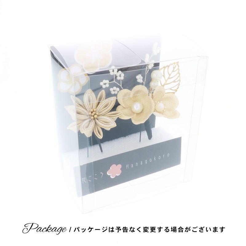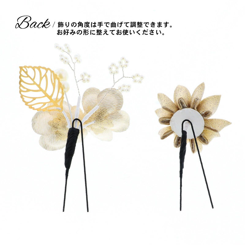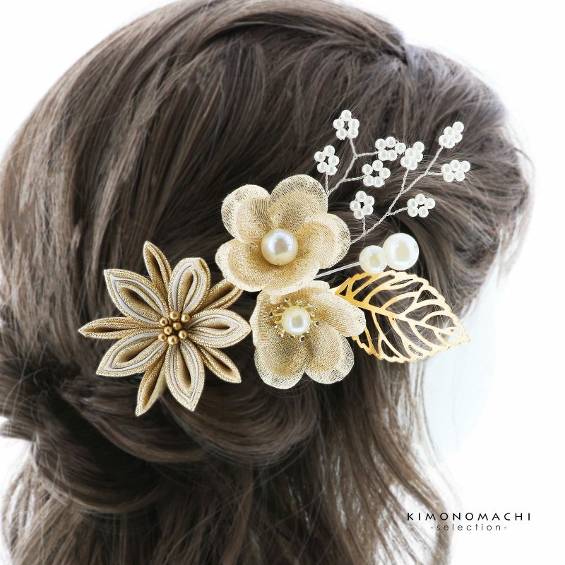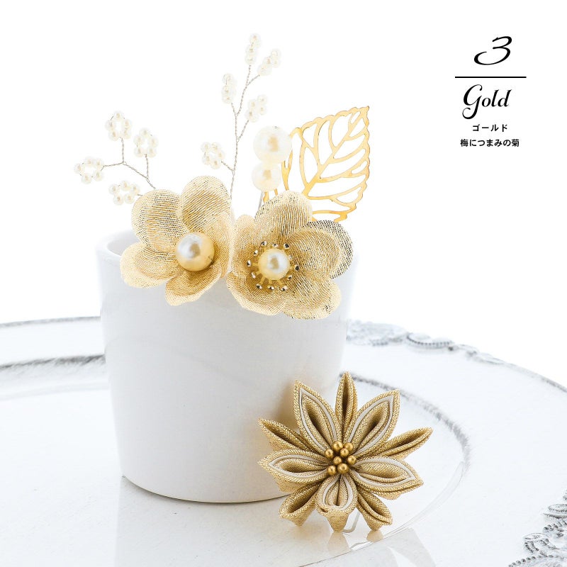 3.ゴールド 梅につまみの菊:ゴールドの花びらにパールの蕊の梅2輪、白のビーズついた枝飾り、パールビーズにゴールドの透かしのメタルリーフのUピン1点。ベージュとゴールドの2重剣つまみの菊のUピン1点。