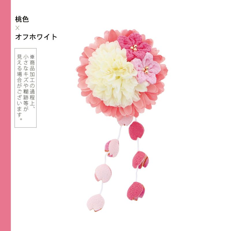 5桃色×オフホワイト…淡い桃色と、クリーム色を重ねた丸いお花。サイドに濃いピンクと薄ピンクのつまみの花、ゴールドのビーズ。ピンク色系の桜の形の房飾り。