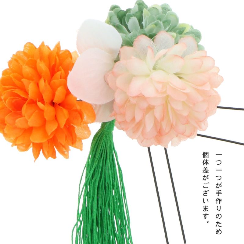 03.薄桃×青磁×緑、オレンジ…1点は淡い桃色ぼかし、淡いアンティークグリーンのマムに白のお花、つやのある緑のタッセル。もう1点は明るいオレンジのマム。