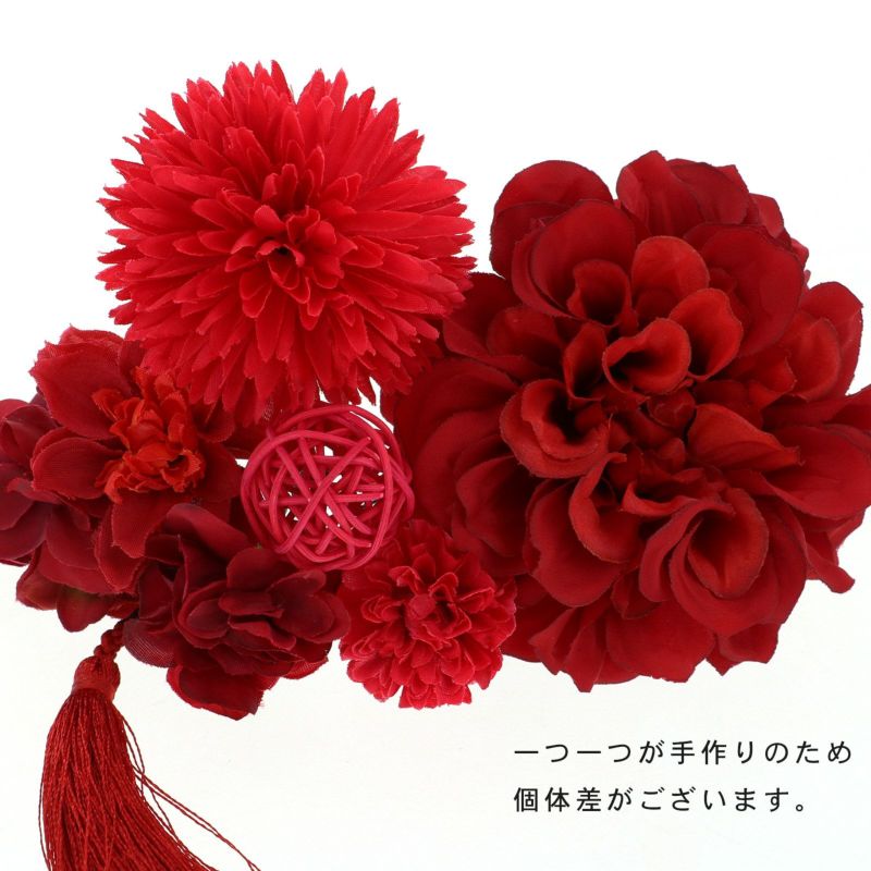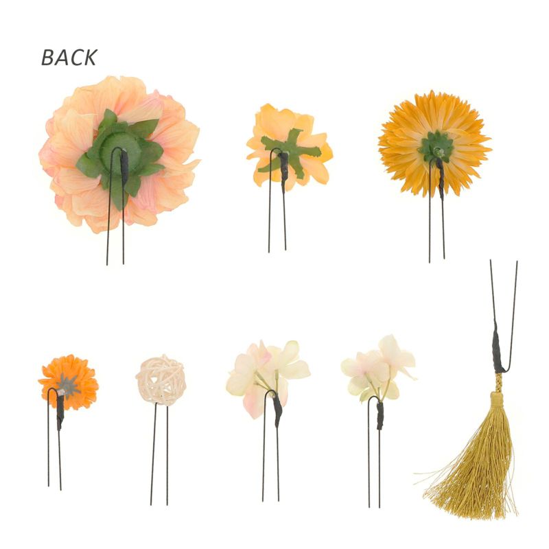 お花とマムと房飾りをセットにしたUピンタイプの髪飾り8点セットです。散らしてつけても、まとめてつけてもオススメです。他の髪飾りと組み合わせて。