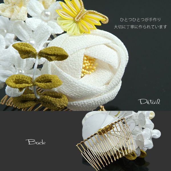 (卒業式応援75%SALE 2/19迄)【Prices down3】つまみ細工コーム髪飾り「白色の薔薇、小花と蝶」成人式 結婚式 フラワーコーム つまみのお花髪飾り 卒業式の袴にも (TF15-05)【メール便不可】ss2512wkk55