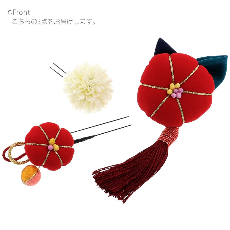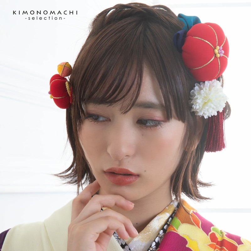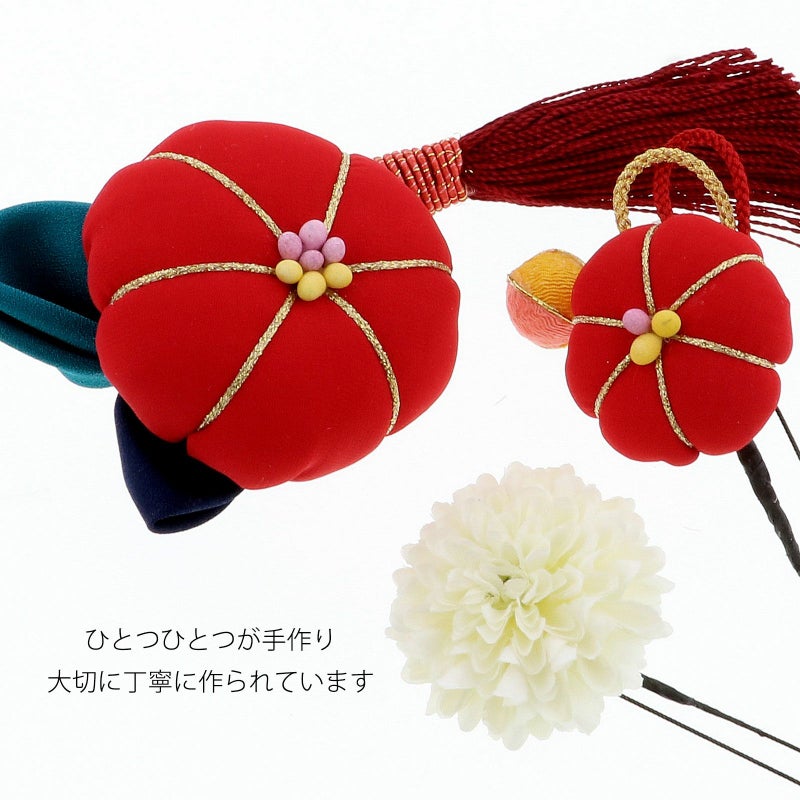 ぽってりとした椿の花のような髪飾り。赤地に金糸をかけたお花、青緑色と紺のつまみの葉、深い赤の房飾り。Uピンは同じく赤に金色のお花に黄色と淡いサーモンの玉飾り、赤と金の組紐。淡いクリーム色の花。