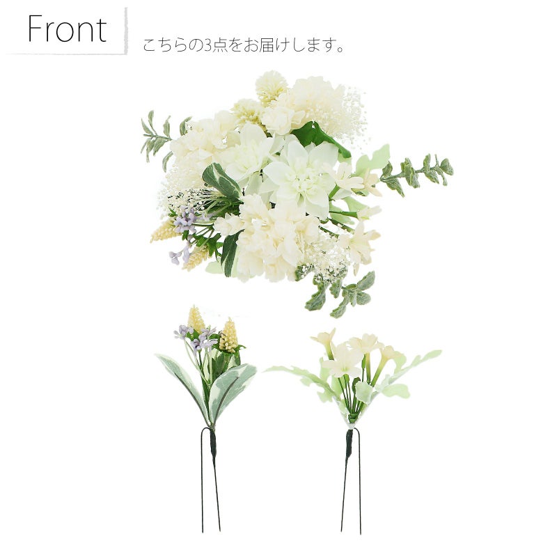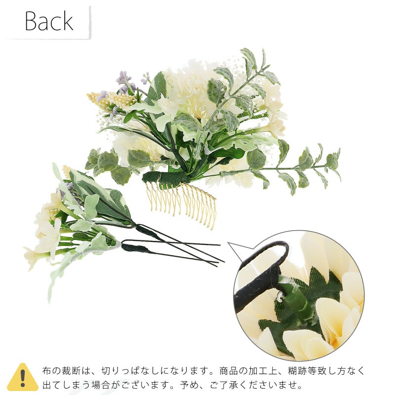 【カラー】白とグリーンを基調としたブーケのようなコームとUピンセット。オフホワイトやアイボリーのダリアにアナベル、バルーンフラワー、カスミソウ。クリーム色や薄紫色の小花。アンティークグリーンやアイスグリーンのリーフ、ミントなど。