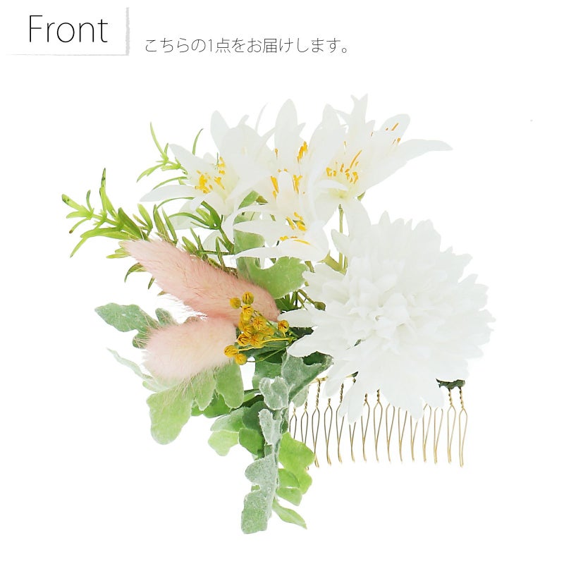 【カラー】ホワイトのお花を中心としたブーケのコーム。白のマム、黄色の蕊がポイントのゼフィランサス、淡いピンクのテールリード、黄色の小花、アイスグリーンや黄緑のリーフがナチュラルな雰囲気です。