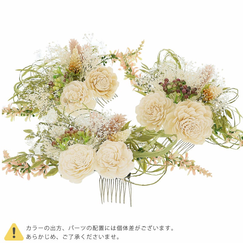 【カラー】白を基調とした野の花のコームとUピンのセット。オフホワイトのローズをメインに、白のカスミソウや淡いピンク、赤紫の小花、落ち着いた黄緑の葉にコーラルピンクのヒースなどのコーム。オフホワイトのローズ、カスミソウに薄紫のアネモネ、青紫の小花などのUピン。