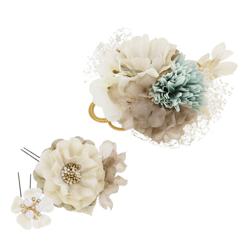 コームはパールホワイトと浅いゴールドの花びらに金と白のペップのアネモネや、グレージュとオフホワイトのアジサイ、淡いブルーグレーのマム、白のカスミソウ、ゴールドのリーフやチュール、組紐にゴールドやオフホワイトの花びらの房。Uピンはコームと同じアネモネに、グレージュのアジサイ。乳白色のアクリルの花びらに白色系のパールやビジューのお花。