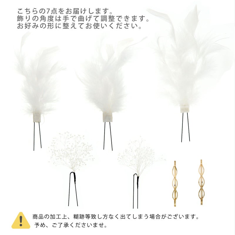 【カラー】白い羽根飾りのUピン3点、カスミソウのUピン2点、ゴールドの波型のヘアピン2点。楽しいデザインの化粧箱入り。