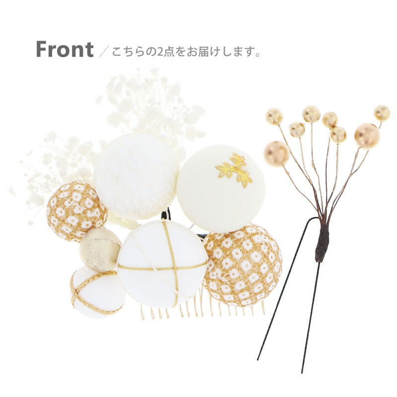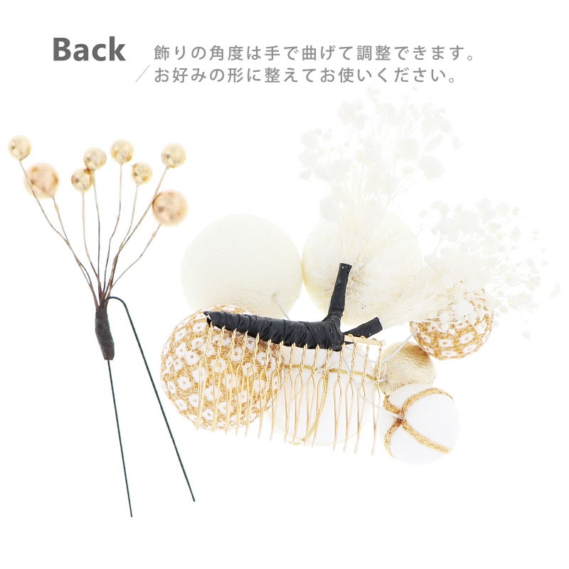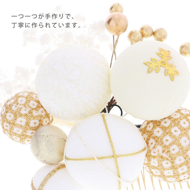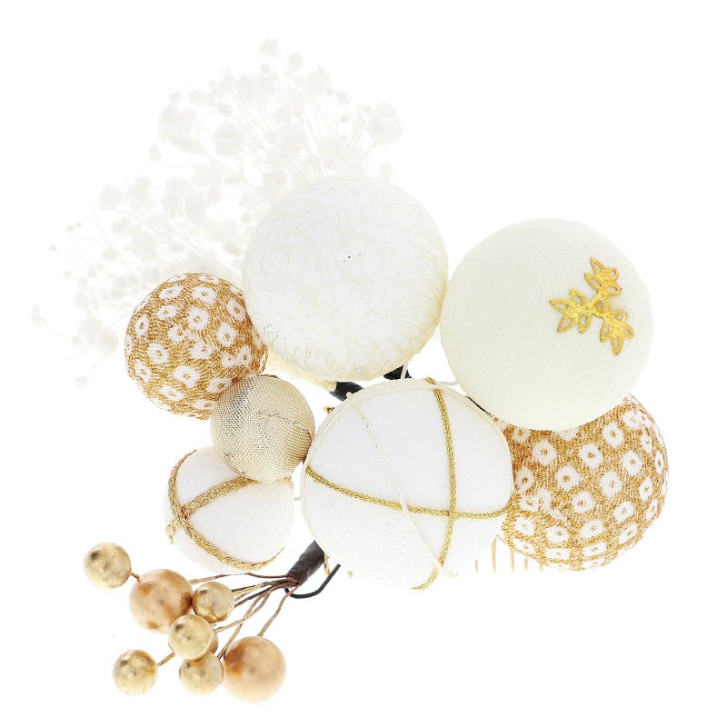 白地にゴールドの糸を掛けたものや、チュールをかぶせたもの、白×金の鹿の子模様、ゴールドなどの大小の玉飾りに白のカスミソウを組み合わせたコーム。ブロンズゴールドの実を束ねたUピン。