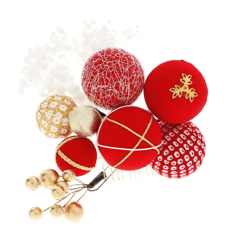 赤地にゴールドの糸を掛けたものや、チュールをかぶせたもの、赤の鹿の子模様、ゴールドなどの大小の玉飾りに白のカスミソウを組み合わせたコーム。ブロンズゴールドの実を束ねたUピン。