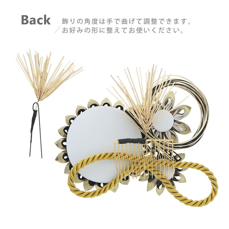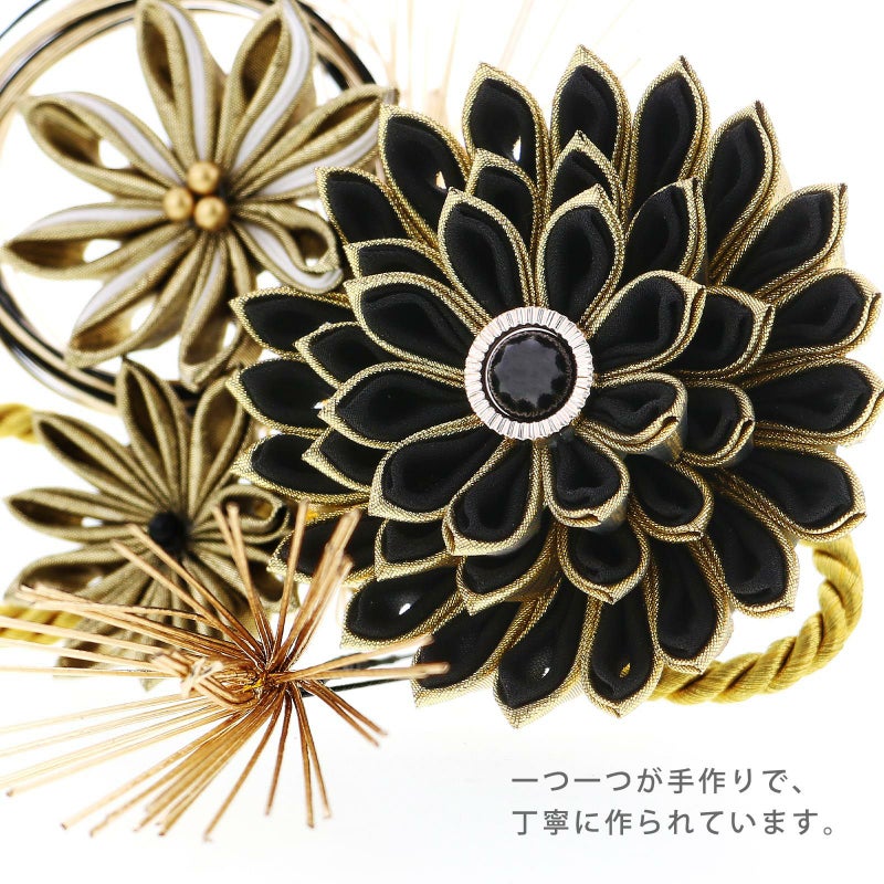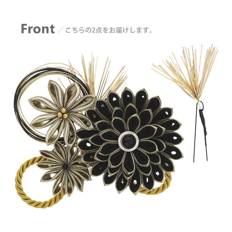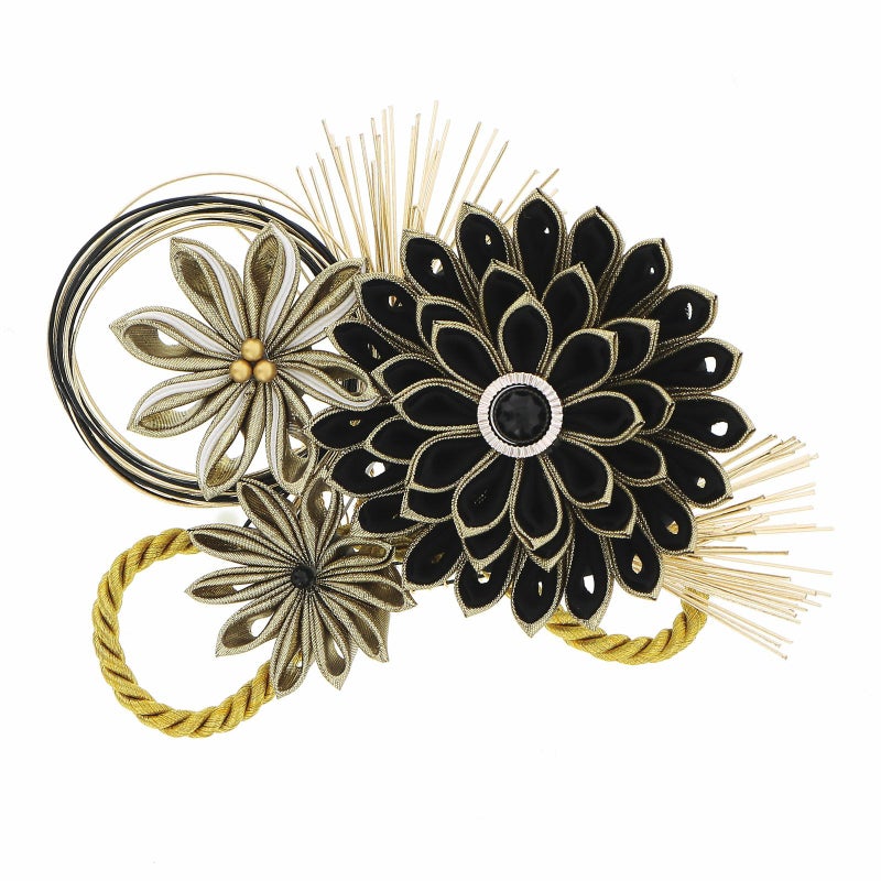 黒とゴールドの剣つまみの大輪の菊、白とゴールドの菊、ゴールドの菊に、ゴールドとブラックの水引、イエローゴールドの紐飾りを組み合わせたコーム。ゴールドの水引の松葉のUピン。
