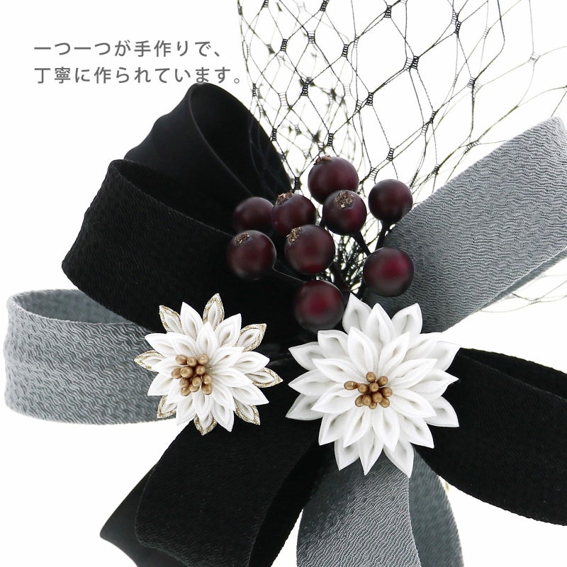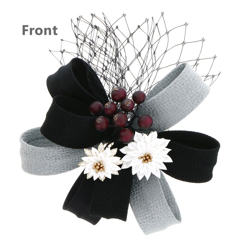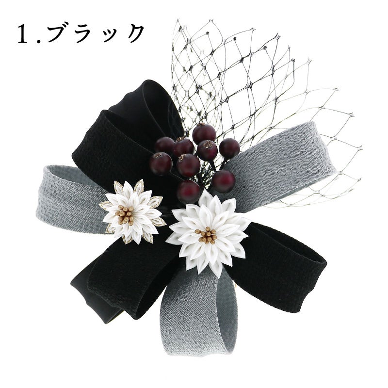 1.ブラック・・・黒とグレーのサテンや縮緬のリボンの花びらのお花。中心に白のつまみの剣菊、黒紫色の実。黒のチュール。