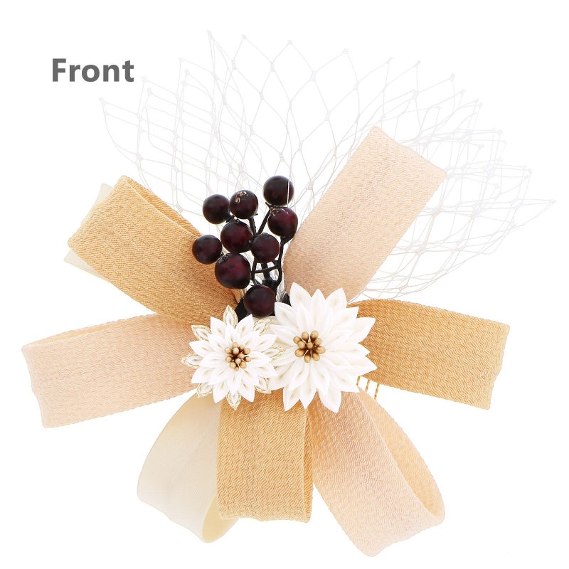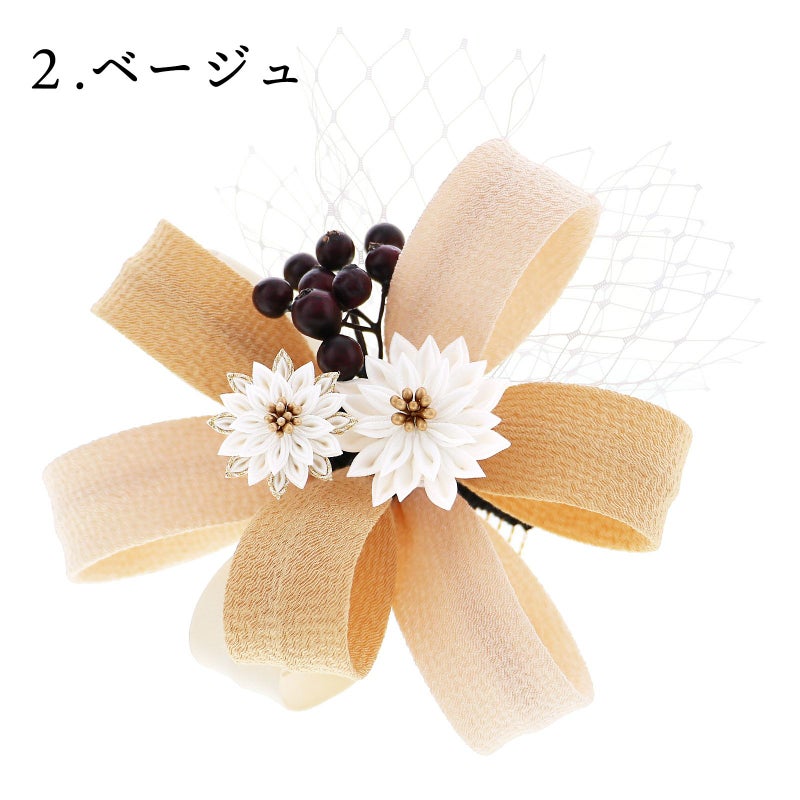 2.ベージュ・・・ベージュとアイボリー、バニラ色のサテンや縮緬のリボンの花びらのお花。中心に白のつまみの剣菊、黒紫色の実。白のチュール。