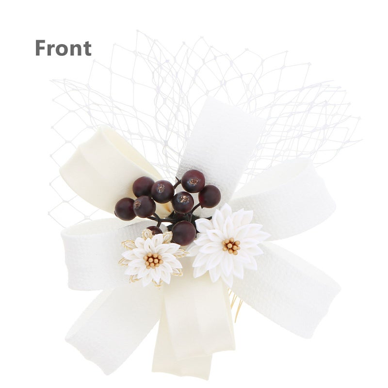 3.ホワイト・・・白とアイボリーのサテンや縮緬のリボンの花びらのお花。中心に白のつまみの剣菊、黒紫色の実。白のチュール。