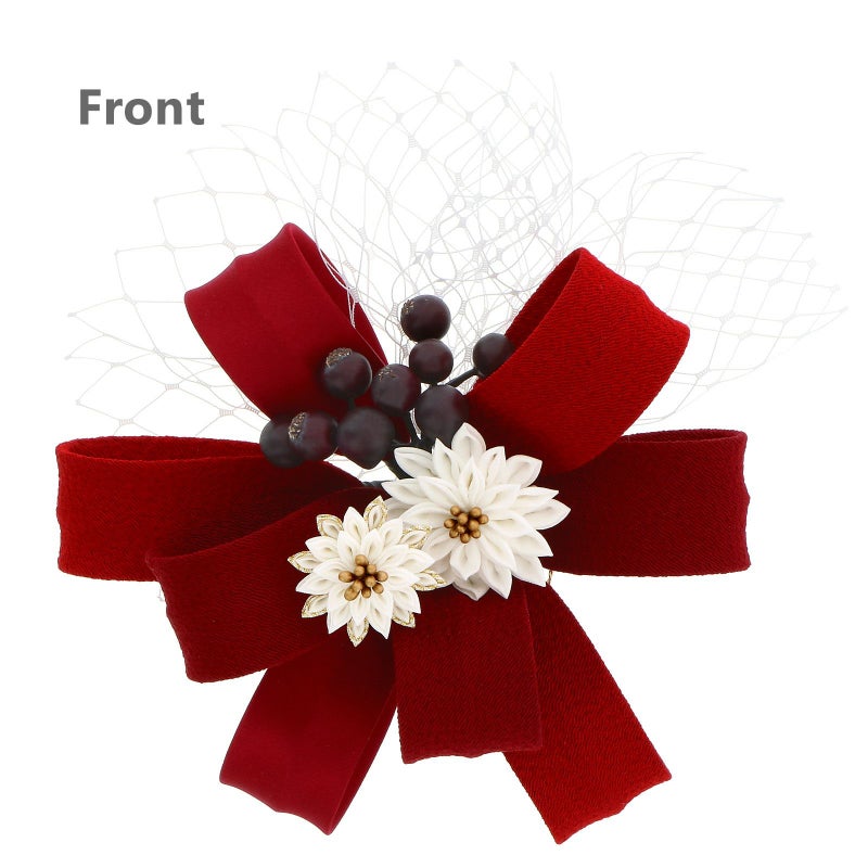 4.レッド・・・赤とディープレッドのサテンや縮緬のリボンの花びらのお花。中心に白のつまみの剣菊、黒紫色の実。白のチュール。