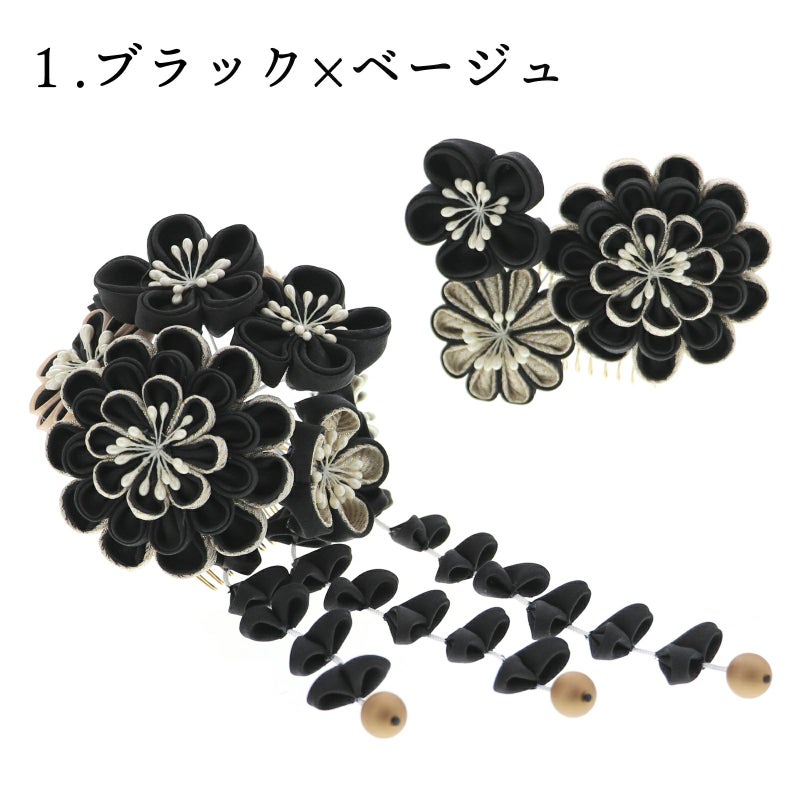 1ブラック×ベージュ・・・黒とゴールドラメ、黒とベージュの丸つまみに白のペップの八重菊や梅を組み合わせた花飾り、房下がりは白の紐に黒のつまみの花びら、先端にマットなブロンズビーズ。黒とゴールドラメの八重菊と梅。