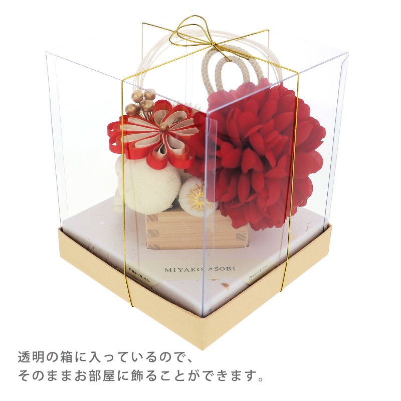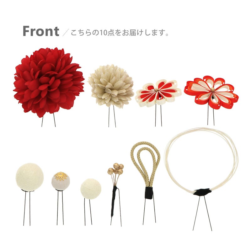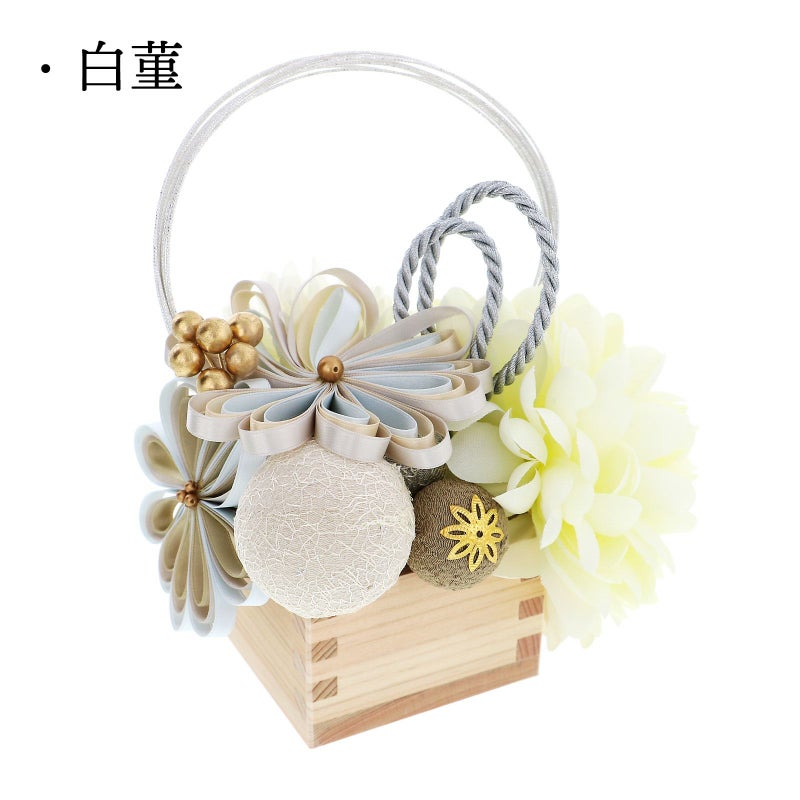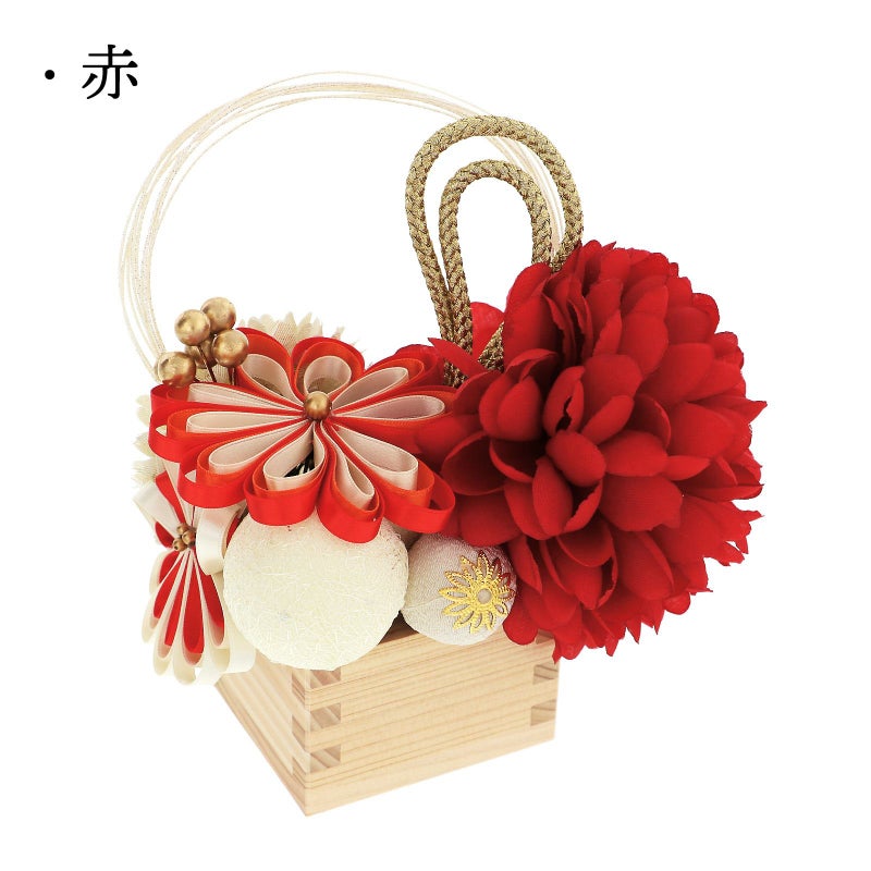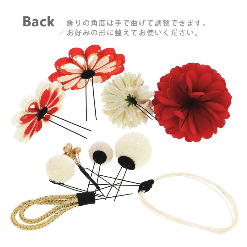 こちらの髪飾りは、Uピン仕様のセットで装着も簡単。ショートヘアからロングヘアまで、髪型を気にせずにお使いいただけます。ヘアスタイルに合わせて、髪飾りのボリュームが調整できます。また、お好みの位置に分けてアレンジが可能です。「祝枡(祝います)」という縁起がよい枡にアレンジしてお届けいたします。
