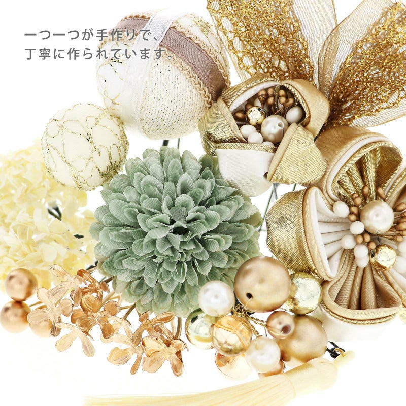 ゴールド:丸つまみの花・大、小は白とベージュ、ゴールドを重ねた花びらに白やブロンズ、パールのペップ。玉飾り・大は白地にゴールドのレース、白のリボンとベージュのブレードリボンの縁取り。玉飾り・小はアイボリーにゴールドのチュール。淡い灰緑色のマム1点、クリーム色の小花アジサイ1点、ゴールドのアナベル1点、ブロンズゴールド、クリアブラウンのビーズ飾り1点、ブロンズのビーズ飾り・小1点、アイボリーのタッセル1点、ブラウンにゴールドのレースのリボン飾り1点。