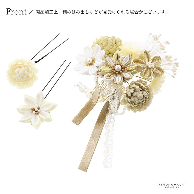 【色柄】白×クリーム色×ゴールドの二重剣つまみの菊に白やゴールドのつまみのお花、淡いカーキやベージュのマム、白いペップ、白いレースやベージュのリボンを組み合わせたコーム。白×クリーム色の二重剣つまみのお花のUピン。オフホワイトのマムのUピン。