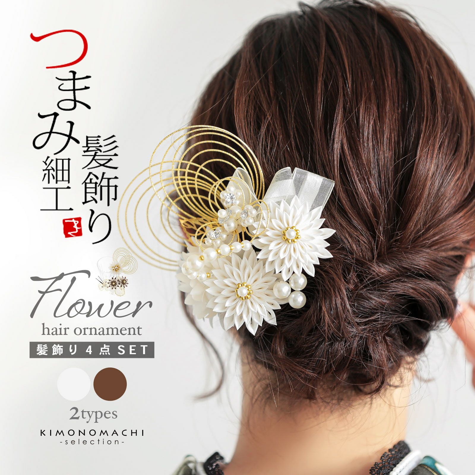 (卒業式駆け込みSALE3/19迄)成人式 髪飾り つまみ髪飾り Uピンの4点セット「シロ/ゴールド・ブラウン/ゴールド 剣菊にリボン、水引」日本製 振袖用髪飾り お花髪飾り 成人式 卒業式 結婚式 着物【メール便不可】