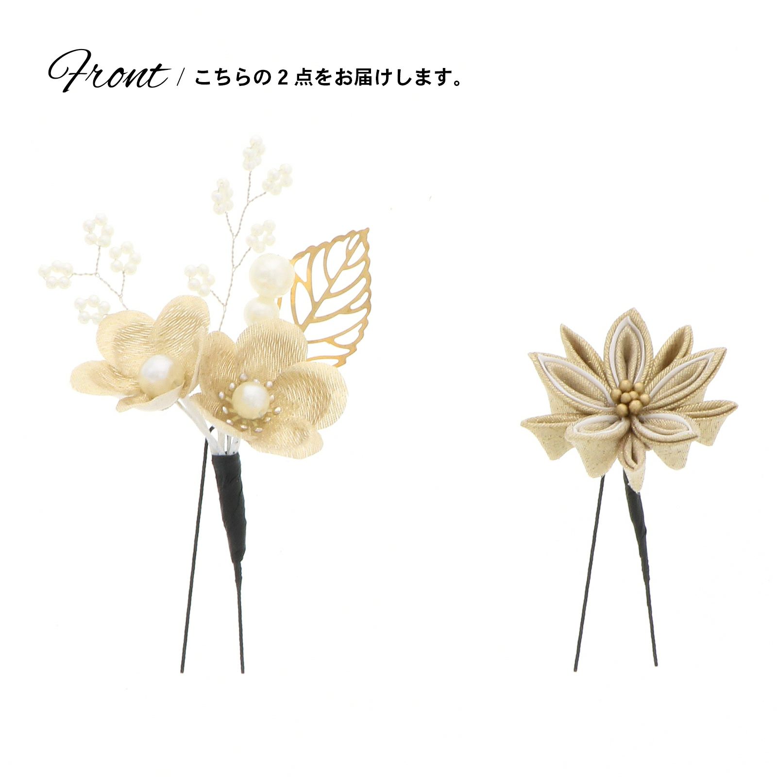 3.ゴールド 梅につまみの菊:ゴールドの花びらにパールの蕊の梅2輪、白のビーズついた枝飾り、パールビーズにゴールドの透かしのメタルリーフのUピン1点。ベージュとゴールドの2重剣つまみの菊のUピン1点。