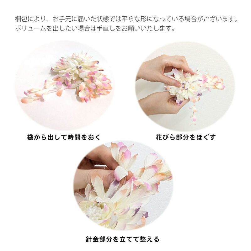 爽やかな色合いのお花に下がり飾りがかわいいお花髪飾りです。