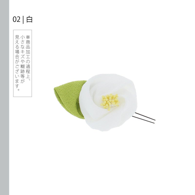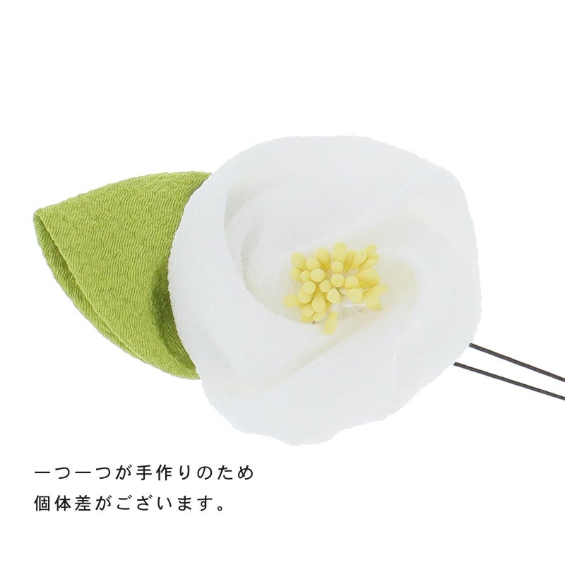 2 白:ちりめん細工の椿のお花のUピン。白のお花、淡い黄色のペップ、黄緑色の葉。