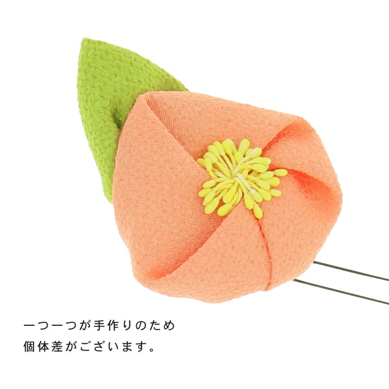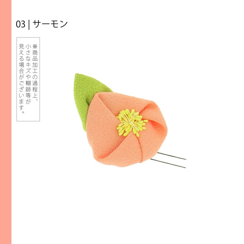 3 サーモン:ちりめん細工の椿のお花のUピン。やわらかいサーモンオレンジのお花、淡い黄色のペップ、黄緑色の葉。