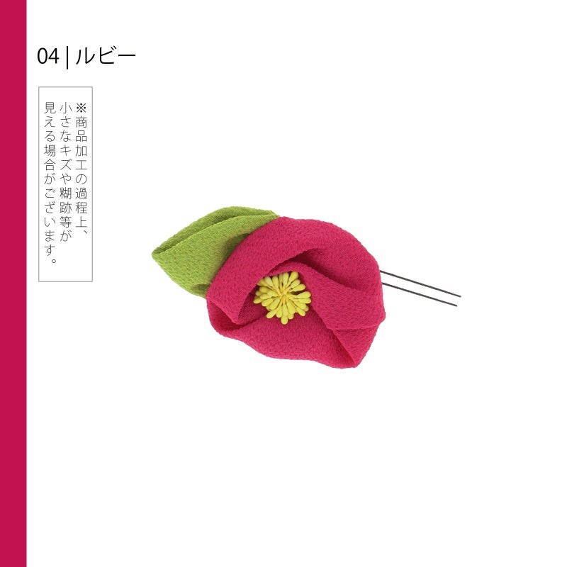4 ルビー :ちりめん細工の椿のお花のUピン。深いピンクみの赤紫のお花、淡い黄色のペップ、黄緑色の葉。