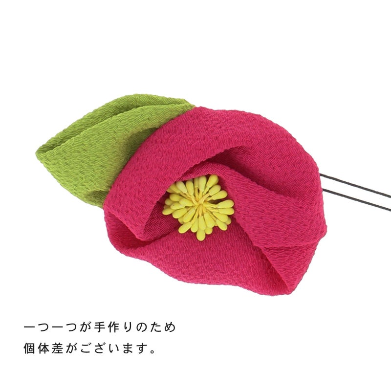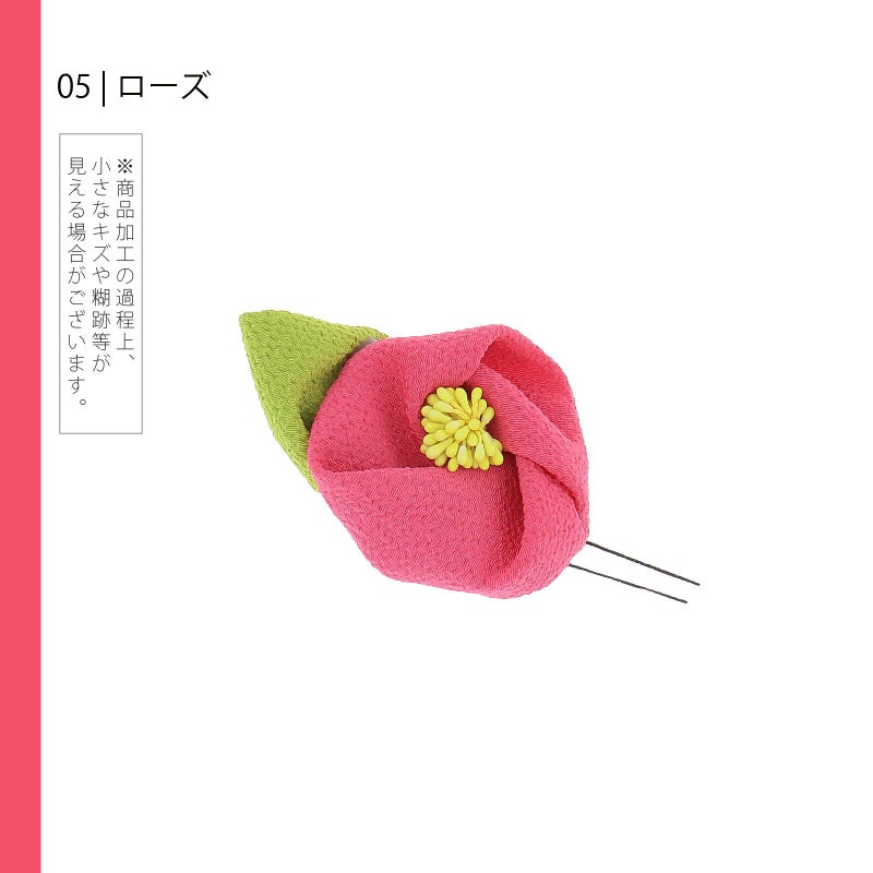 5 ローズ :ちりめん細工の椿のお花のUピン。やわらかい深いピンクのお花、淡い黄色のペップ、黄緑色の葉。
