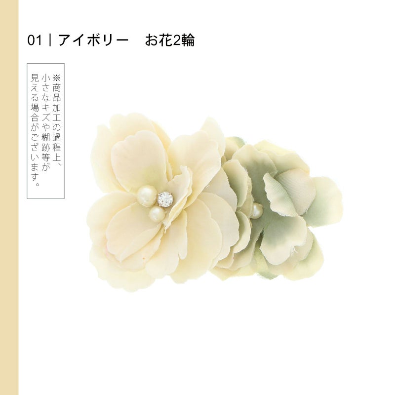 1アイボリー お花2輪:アイボリーのお花と、アイボリーに淡いアンティークグリーンのぼかしのお花の髪飾り。中央に白色系のパールビーズやラインストーン。