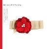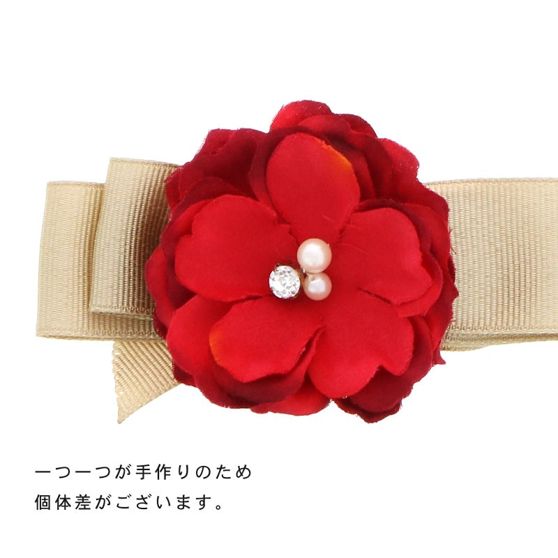 2レッド×ベージュ:深い赤系のお花、中央に白色系のパールビーズやラインストーン、ベージュのリボンを組み合わせたクリップ髪飾り。