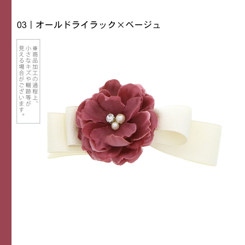 3オールドライラック×ベージュ:アンティーク調のグレイッシュな赤紫のお花、中央に白色系のパールビーズやラインストーン、淡いベージュのリボンを組み合わせたクリップ髪飾り。