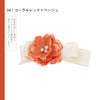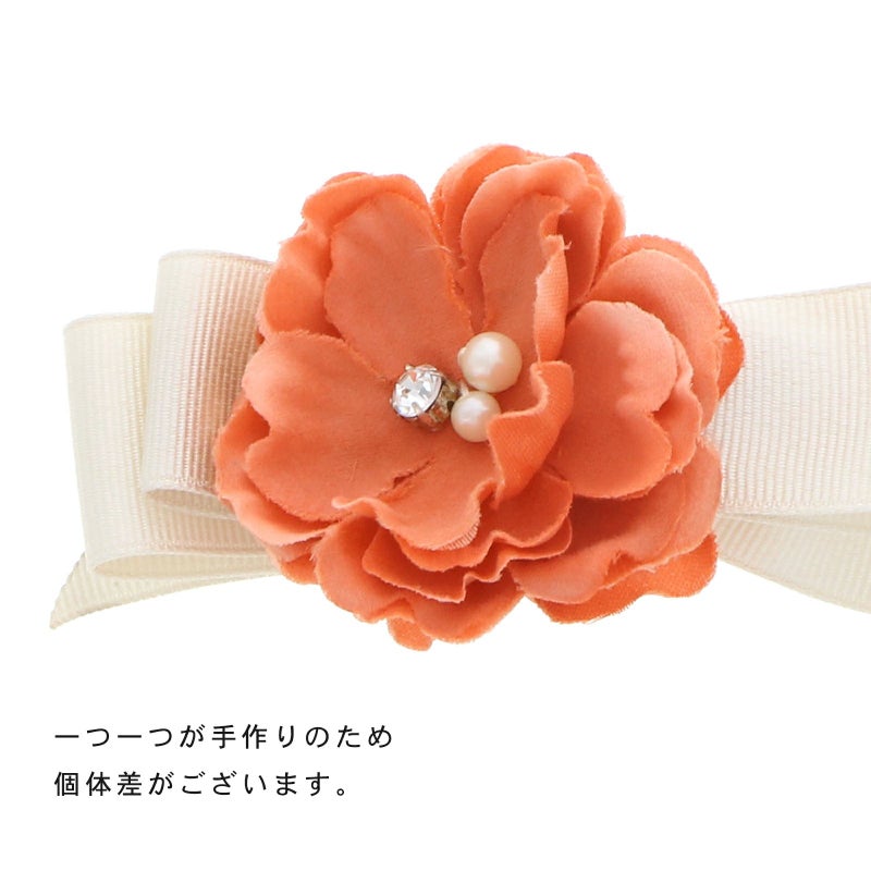 4コーラルレッド×ベージュ:アンティーク調の浅いオレンジのお花、中央に白色系のパールビーズやラインストーン、淡いベージュのリボンを組み合わせたクリップ髪飾り。
