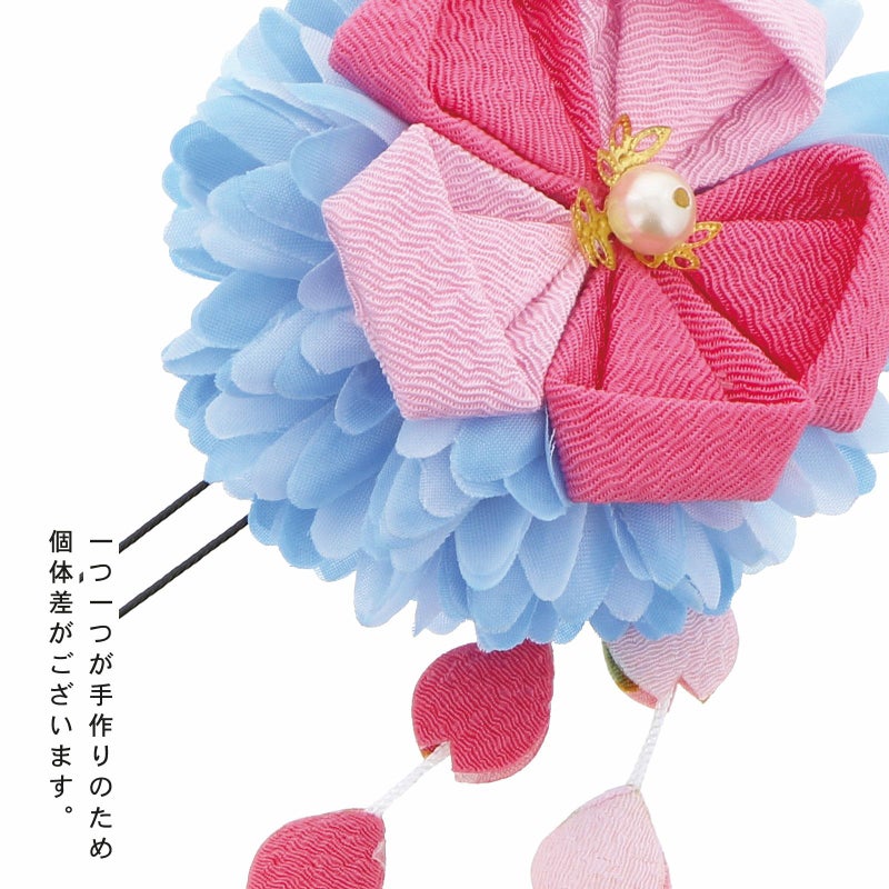 2ピンク×ブルー:淡いブルーのマム(菊)の造花に、濃ピンクと薄ピンクのつまみのお花を重ねたデザイン。中央にパールビーズや花座。ピンク色系の桜の形の房飾り。