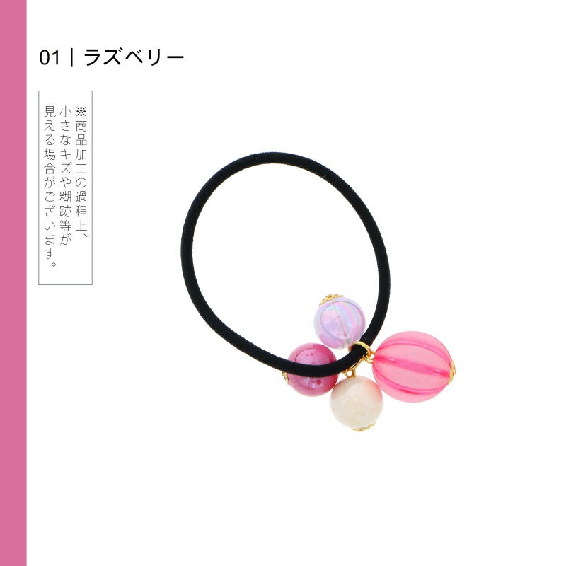 1ラズベリー:キャンディのようなビーズ飾りのヘアゴム。淡い赤紫色系のピンクの縞、虹色の光沢のあるピンク、ラズベリー、ミルキーホワイト。ゴールドの菊座。ゴム部分は黒。