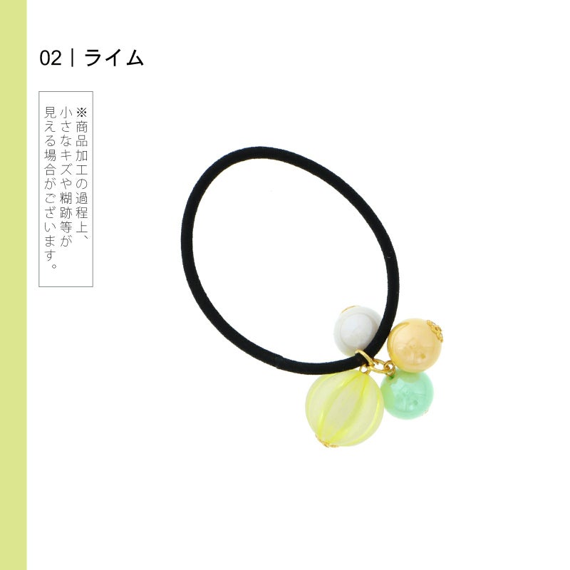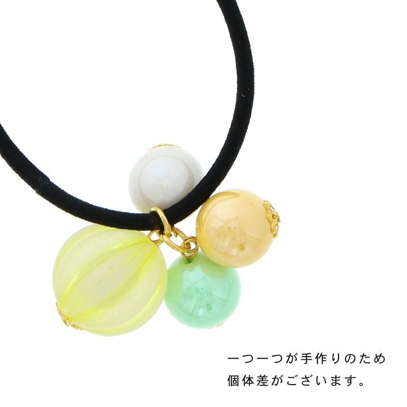 2ライム:キャンディのようなビーズ飾りのヘアゴム。淡いライムイエローの縞、浅いイエロー、アイスグリーン、ミルキーホワイト。ゴールドの菊座。ゴム部分は黒。